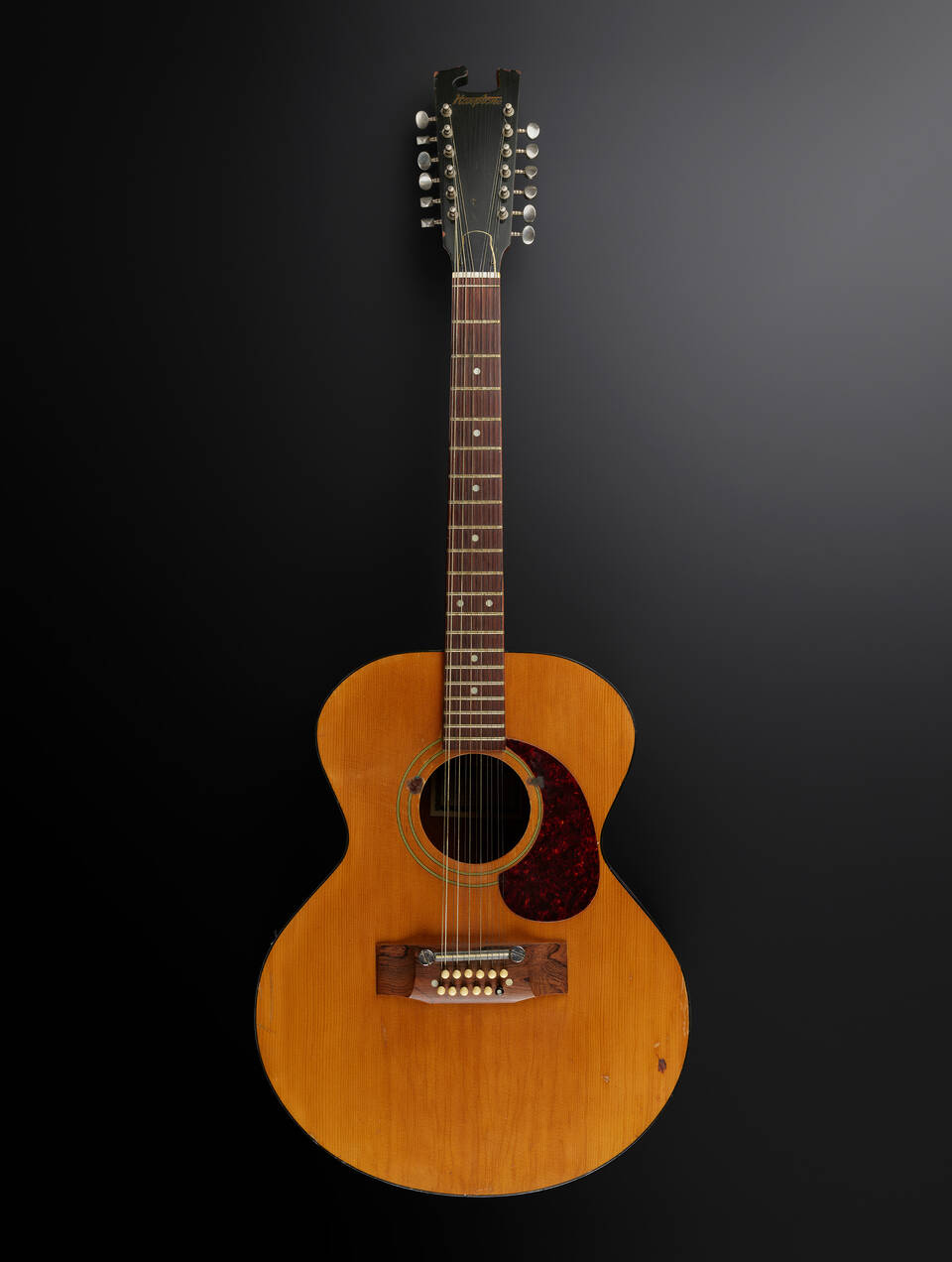 Harptone 12-string acoustic guitar and case used by David Bowie on Ziggy Stardust and the Spiders from Mars and Let's Dance, about 1970, US -
