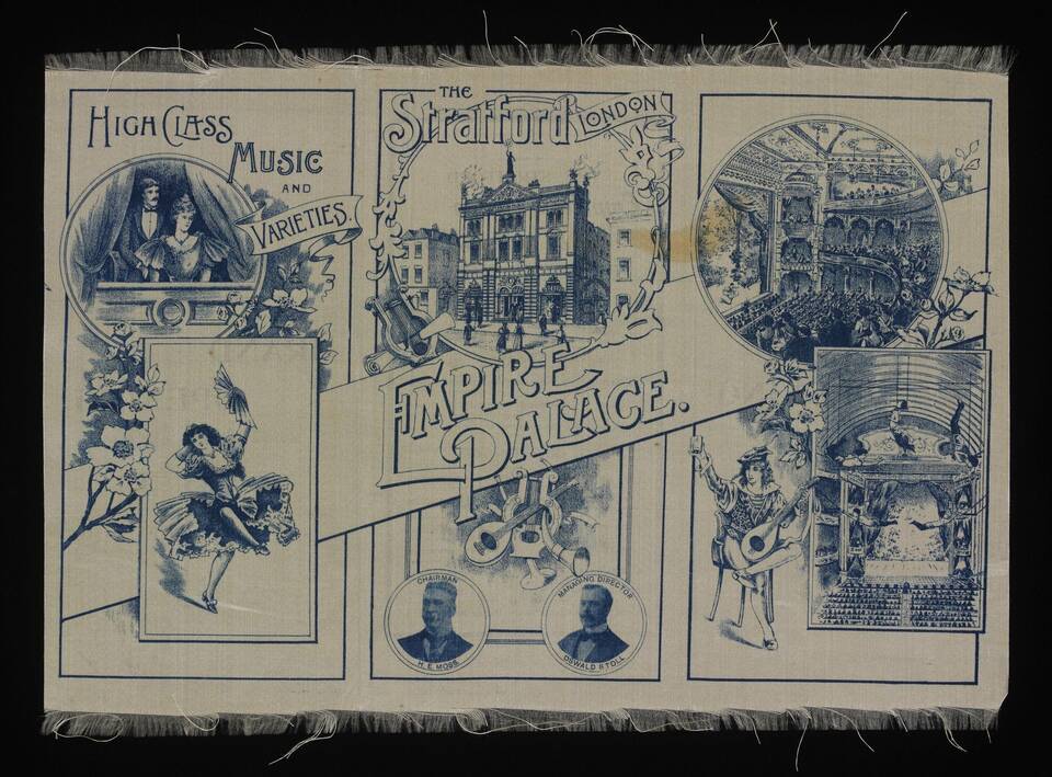 Silk programme printed for the 'Grand Opening Night' of the Empire Palace Theatre Stratford, London, designer unknown, 1899, London, England -