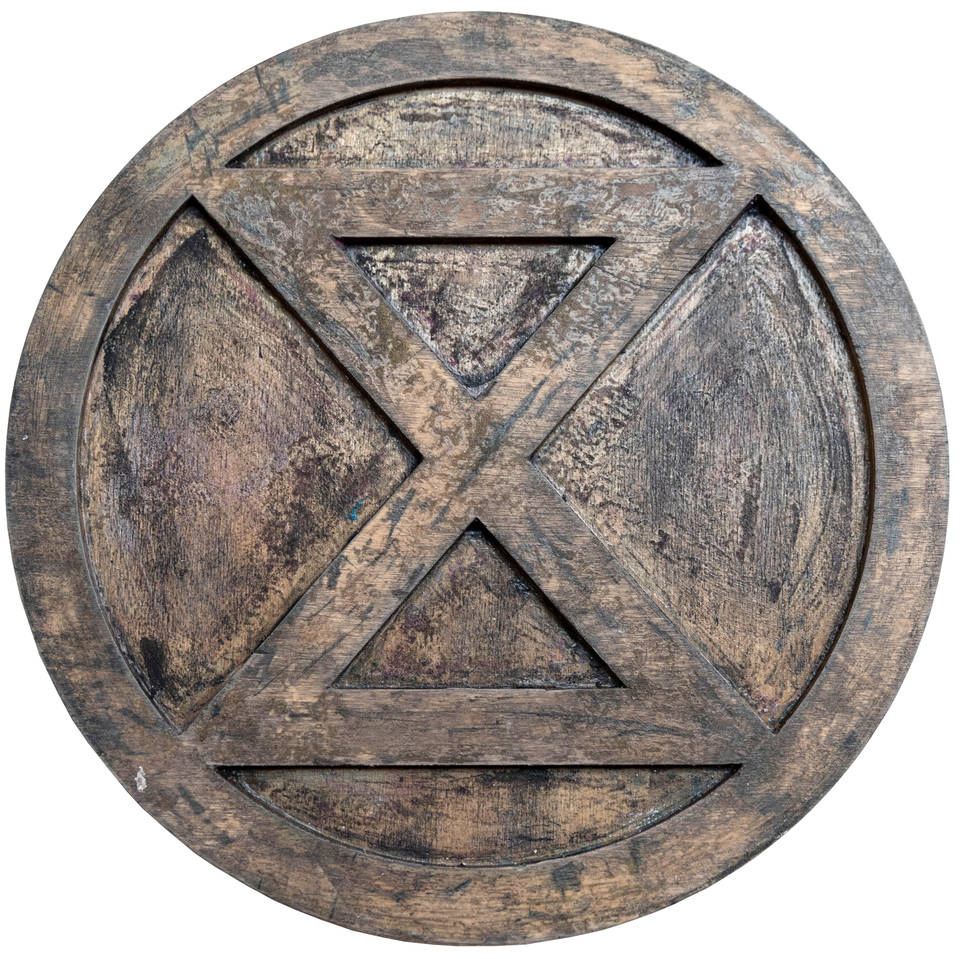 3D-printed Extinction Rebellion logotype woodblock -